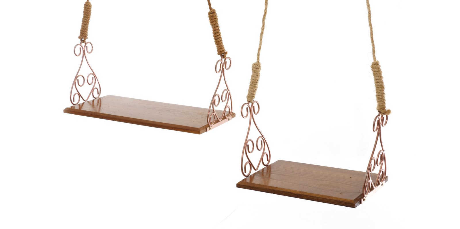 Balanço de madeira com corda rústica e detalhe em ferro rose
