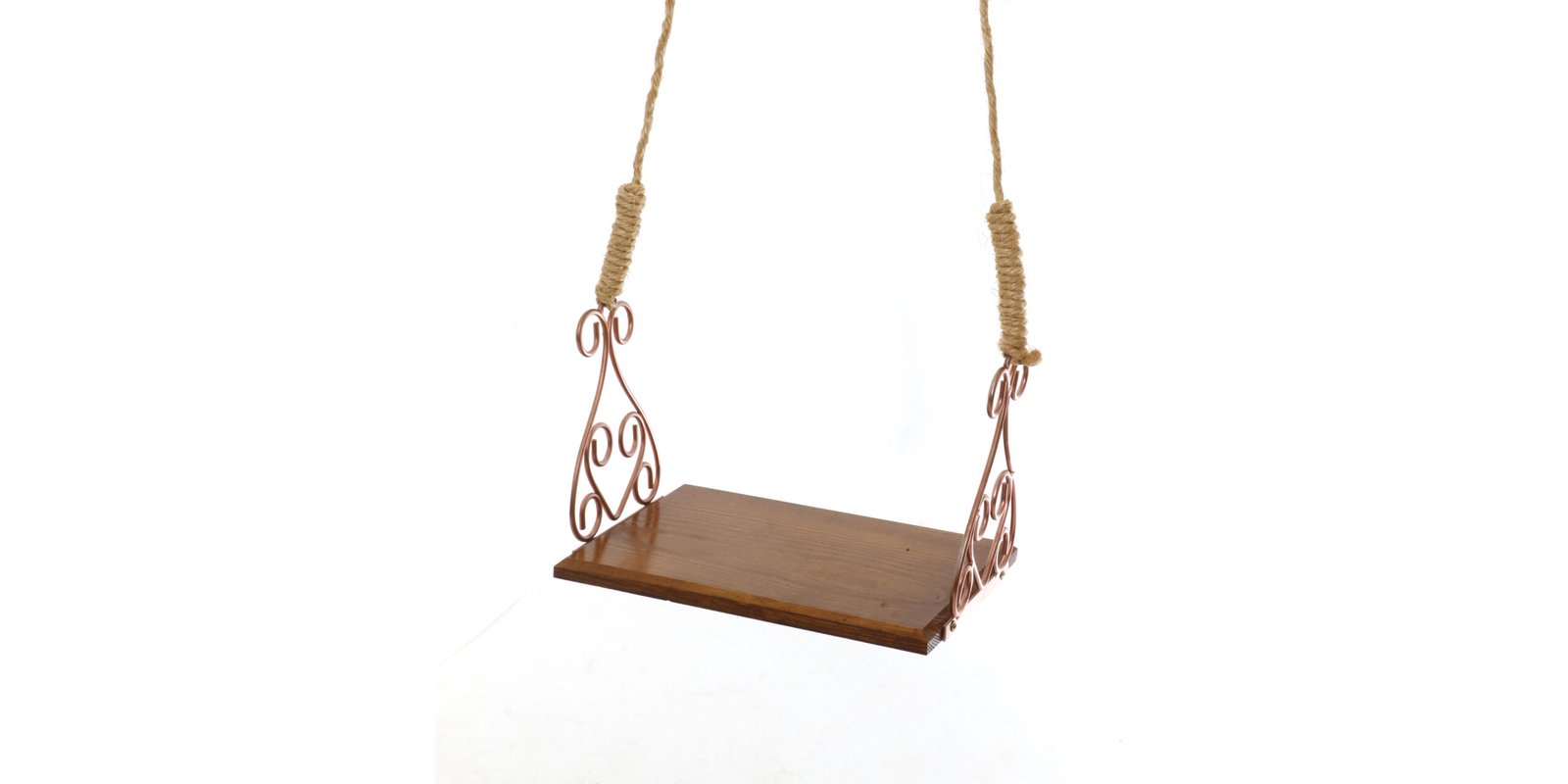 Balanço de madeira com corda rústica e detalhe em ferro rose