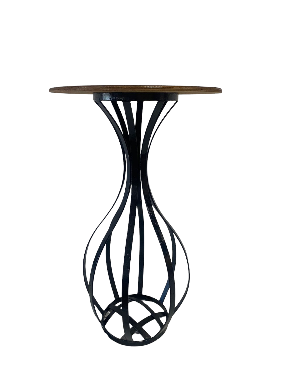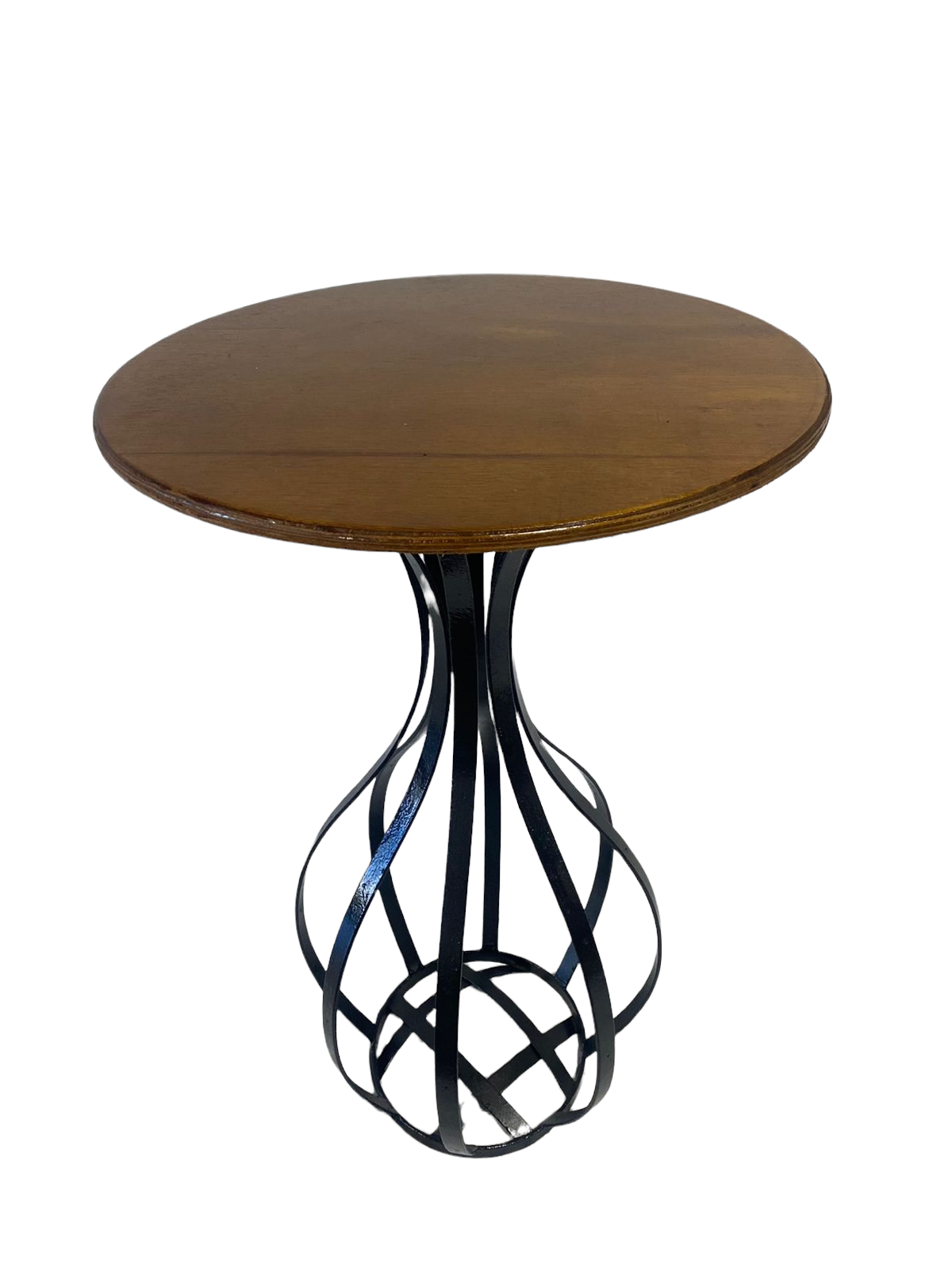 Mesa bristro, tampo de madeira e base de ferro em tiras.