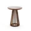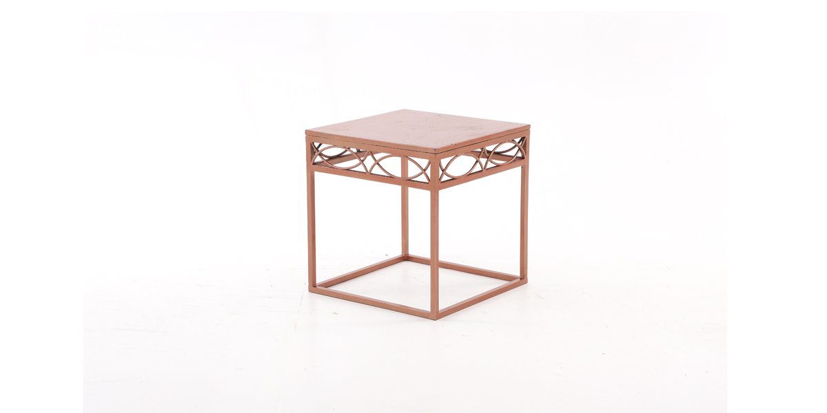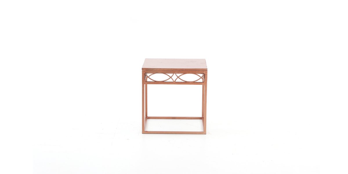 Mesa de canto com armação de ferro e tampo de madeira na cor cobre