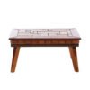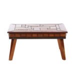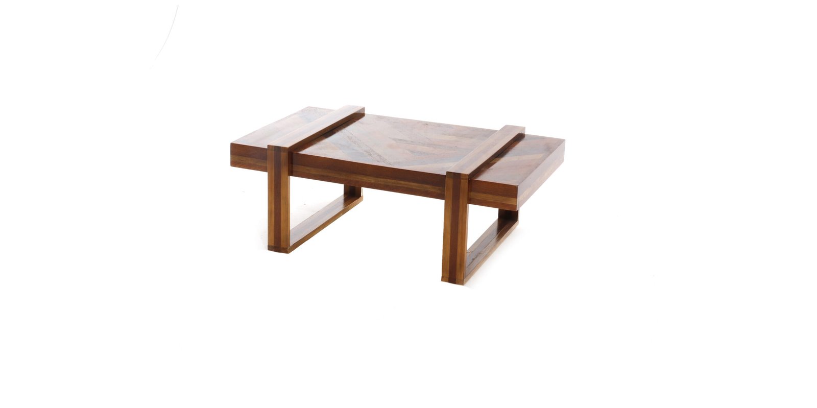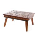 Mesa de centro de madeira retangular com detalhe de faixa de madeira.