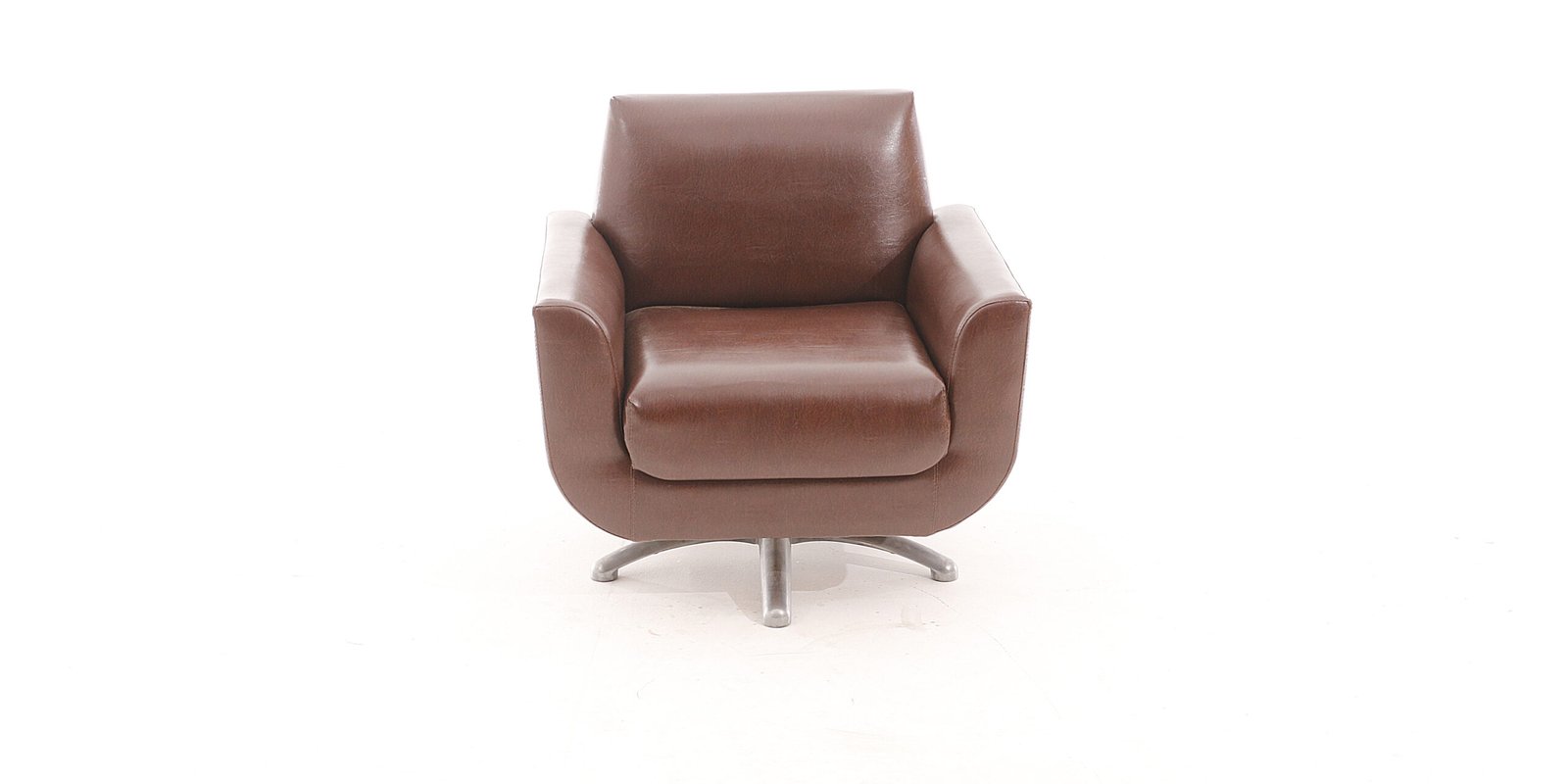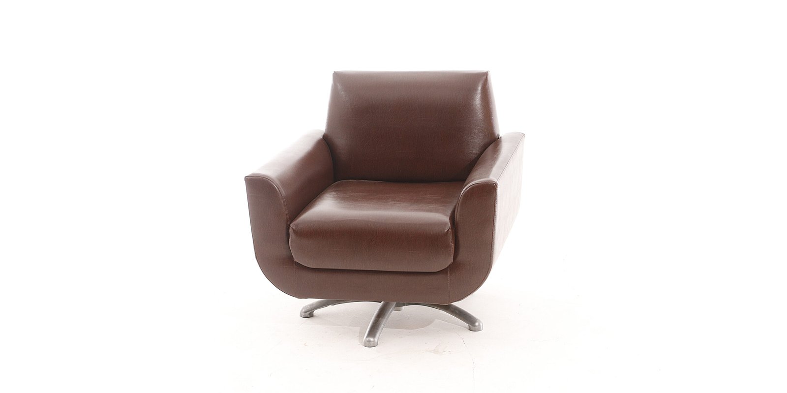 Poltrona em courino marrom com base giratória.