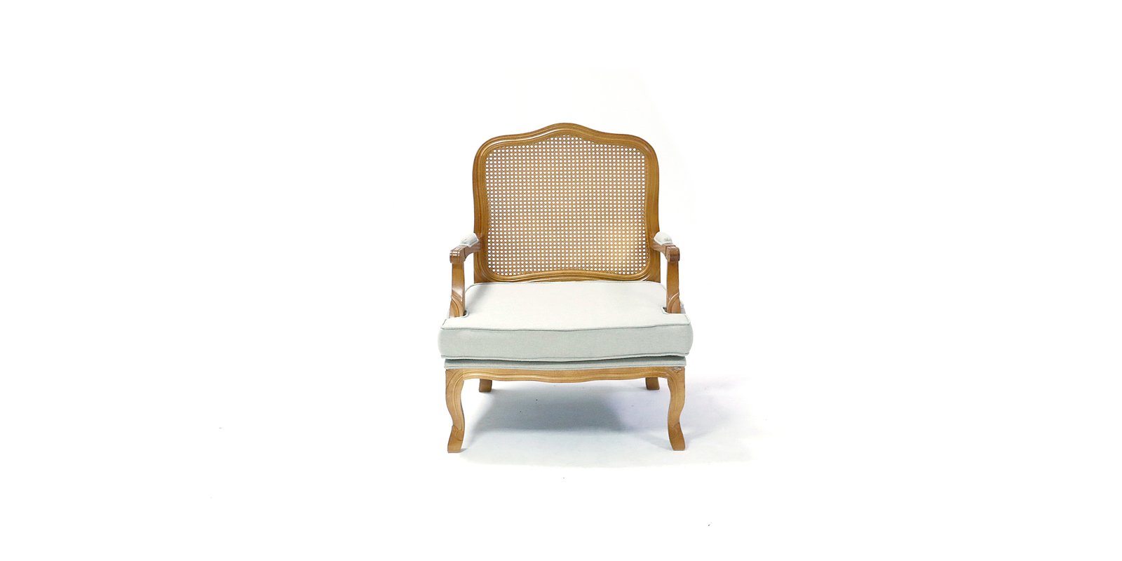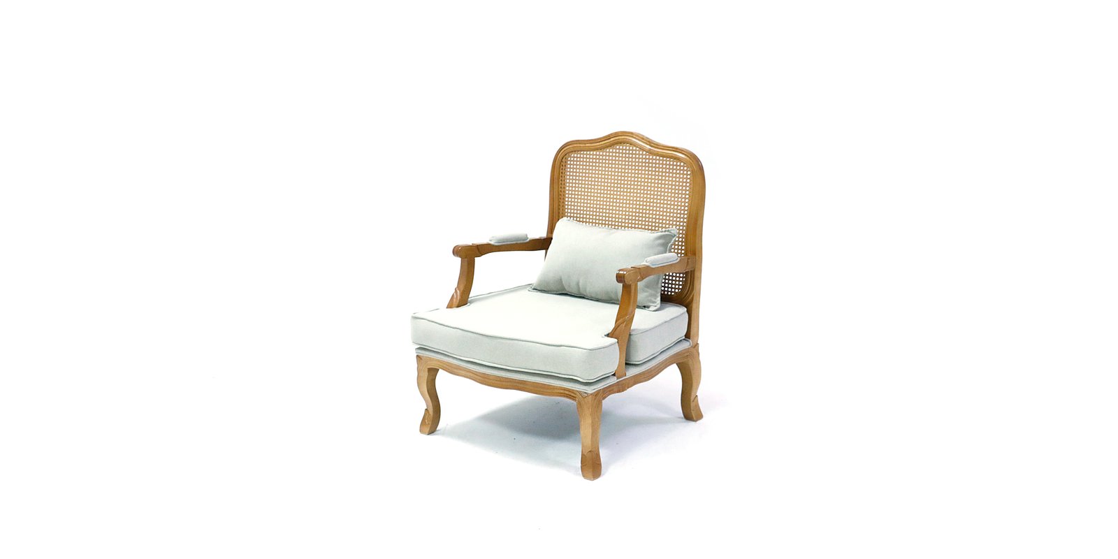 Poltrona de madeira com almofada em tecido animal branco e encosto em tela