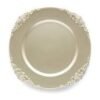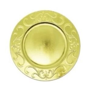 Sousplat de polipropileno e carbonato de cálcio cor dourado com detalhe em relevo de arabesco na borda